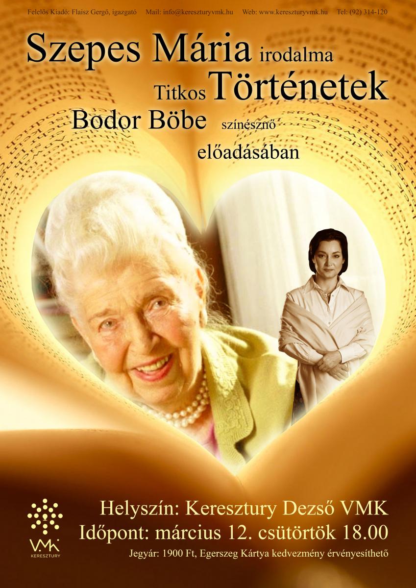 Szeretettel várunk minden kedves érdeklődőt BODOR BÖBE színművésznő, rendező, Szepes Mária-díjas alkotóművész előadására, mely Szepes Mária remekműveinek hivatott emléket állítani, illetve az Írónő gondolatait népszerűsíteni az arra nyitottak körében.